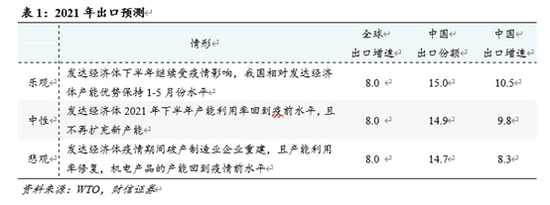 预计下半年出口份额在15%左右,全年与去年基本持平。上半年我国出口份额依然在高位,下半年出口份额有望趋稳,全年出口份额在15%左右。根据世界贸易组织(WTO)对2021年全球商品贸易增长8%的预测,预计2021年我国出口增长10%左右。