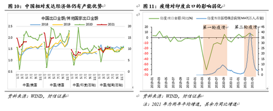 疫情对新兴经济体出口的影响弱化,中国产能“补缺口”机会不大。印度经历过两轮疫情,其中爆发于2021年3月份的第二轮疫情,无论是病毒的传染性还是致死率都高于第一轮疫情,确诊病例也远多于第一轮疫情,但对印度出口的冲击远不如第一轮疫情,在疫情最严重的2021年3~5月份,印度出口两年平均增速较疫情爆发前不降反增(见图11)。同样,东盟国家2021年3月份受到印度疫情的波及,确诊人数激增,但出口仍保持稳定。由此可见,未来新兴经济体因疫情导致停工停产、产能大幅下降概率较小,尽管未来新兴经济体疫情存在反弹风险,但对其出口影响有限,我国大规模替代新兴经济体劳动力密集型产品产能的机会不大。