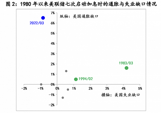 但是与1983-1984年和1994-1995年不同,本次美联储决心对抗通胀明显落后,即“美联储落后于曲线”。例如,按照美联储设定的2%通胀目标和美国自然失业率,分别测算出1980年以来的六次加息启动时的通胀缺口和失业缺口(缺口均为实际值减去目标值),今年3月份美联储启动加息时的【-0.85%,6.5%】——美国的通胀缺口为6.5%,失业缺口为-0.85%,与1983年3月的【4.2%,1.6%】、1994年2月的【1.1%,0.5%】相比,很明显美联储对抗通胀的紧缩举动大幅落后于实际通胀的上升。
