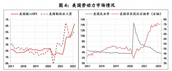 例如,以2021年4月份为基点,截至目前,美国CPI累计提高了8%,核心CPI累计提高了6%,但是CPI中的能源类物价累计提高了32%、交通运输价格累计提高了23%,食品也累计提高了9%。而且在劳动力市场持续紧张的压力下,美国劳动力薪酬水平已经开始趋势性上升。截至目前,美国非农岗位空缺率已升至7%,制造业工资涨幅也提高至5%以上。