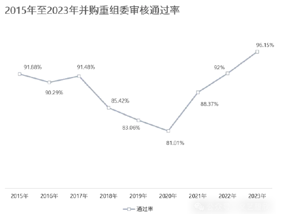 总体来说,近些年发股许可类的重组审核趋势是越来越严,虽然审核通过率在2020年触底后持续回升,2023年的审核通过率高达96.15%,但如我们在《2023年度A股上市公司重组市场回顾》一文中分析的,本身能经历长达一年的审核周期的交易,真到了上会一刻已是百炼成钢,大量交易其实是倒在上会审核前。