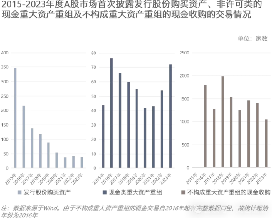 其实2023年所有产业并购占比低只是一个缩影,我们来看2015年上一轮并购潮最高峰以后历年来首次披露发行股份购买资产交易、非许可类的现金重大资产重组及不构成重大资产重组的现金收购的情况: