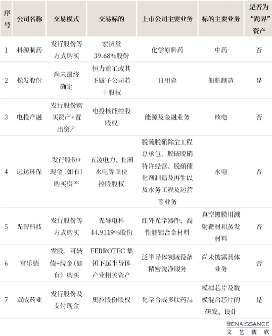 自2024年9月24日至10月9日,共有6起上市公司注入大股东旗下优质资产交易首次披露,其中不乏跨界并购。此外,2024年8月27日首次披露的双成药业(002693.SZ)收购奥拉半导体也同样具有参考意义。其中,松发股份(603268.SH)和光智科技(300489.SZ)均为现任大股东收购来的公司,但由于控制权变更已超过36个月,资产注入未构成借壳。