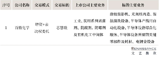 此外,本次交易的方案设计也具有一定的特别之处。首先,芯慧联于2024年6月启动派生分立,将短期内难以盈利的晶圆键合设备等业务分拆独立派生出芯慧联新(苏州)科技有限公司,并未纳入本次交易当中;其次,百傲化学未选择通过现金或发行股份来直接收购芯慧联股份,而采用了“增资+委托表决权”方式实现控制及并表,也为后续跨界并购交易提供新的交易思路。