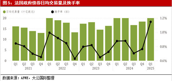 在法国债市面临基本面与政策面双重压力的背景下,投资者对债券收益率上行的预期依然较强,然而市场策略出现显著分化。一部分投资者基于对历史上法国政治动荡多属阶段性特征的判断,认为本轮危机仍属暂时波动,并未形成结构性风险。在此预期下,其持仓结构呈现“趋短避长”的特征,逐步减持长期债券以防期限风险,同时挖掘短端利率产品在高波动环境下的票息和流动性价值。从数据来看,2025年一季度,法国政府债日均交易规模季度环比大幅上涨53.0%,显著高于欧盟其他国家,显示其交易活跃度急剧提升。同时,日均交易量达到200亿欧元、换手率接近1.2%,两项指标均居于欧盟国家前列。高频的交易和换手率的上升,也从侧面反映出投资者正在针对政治和财政风险对法国债券市场风险进行频繁的价值重估。综合来看,法国当前政治和财政前景的不确定性一定程度上加剧了法国债券市场波动性,且在新政府找出平衡议会分歧与推动改革之间关系的有效方法之前,法国债券市场的高波动性或仍将延续一段时间。