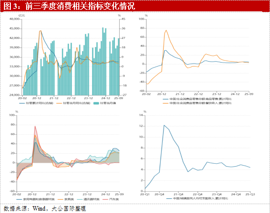 消费市场平稳增长,内需复苏基础尚不牢固。1-9月社零总额达 365,877 亿元,同比增长4.5%。消费在“量”的层面继续回升,但增速仍弱于预期,且环比波动有所加大。消费结构分化明显,商品零售增速反超餐饮收入。“以旧换新”“家电下乡”等专项行动持续推进,耐用品和升级型消费回暖;汽车、家电、通讯设备等板块在补贴、金融支持及促销活动带动下,零售额明显增长。前三季度限额以上单位商品零售同比增长5.1%,其中汽车类增长8.3%,家电类增长 7.6%。2023–2024 年间餐饮恢复曾一度领跑,但今年以来,受就业恢复节奏偏慢以及部分地区餐饮供给过剩的影响,餐饮消费边际趋弱。从消费趋势来看,2025年前三季度居民人均可支配收入增速放缓至4.4%,制约消费能力进一步提升。