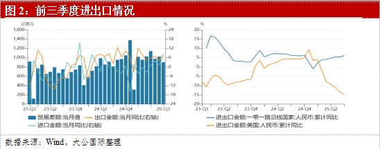 今年外贸表现稳中有进,净出口贡献显著增强,成为经济增长的重要支撑。前三季度我国货物进出口总额达33.61万亿元,同比增长4.0%,其中出口增长7.1%、进口微降0.2%。外贸增速逐季回升,一季度增长1.3%、二季度4.5%、三季度约6.0%。货物和服务净出口对经济增长的贡献率达29.0%,拉动GDP增长1.5个百分点,为近年来的高位水平。“一带一路”等新兴经济体出口支撑作用明显,对“一带一路”国家进出口累计同比6.2%,反超对美进出口金额。产品优势持续显现,“新三样”出口继续扩张,机电产品同比增加8.6%。