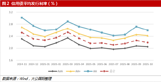 发行成本方面,10月信用债整体发行利率显著下行,这与当月货币政策延续适度宽松、市场资金面保持充裕密切相关。10月央行通过买断式逆回购、MLF合计实现中期流动性净投放6,000亿元,并重启国债买卖净投放200亿元,多工具协同下市场流动性合理充裕。在此背景下,信用债平均发行利率降至2.19%,环比9月的2.26%下降7.46BP,同比则大幅下降39.26BP。