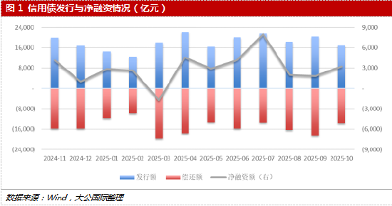 10月,债券市场整体呈现平稳态势,共发行3.92万亿元,同比增长3.71%,净融资额约9,471亿元,其中信用债成为拉动发行规模增长的主要力量,与利率债表现形成分化。当月信用债发行1.69万亿元,延续稳定增势,为实体经济发展有效赋能。后续,在二十届四中全会会议精神的指导下,更加积极的财政政策将持续用力,货币政策或将通过降准、降息及结构性工具为信用债发行营造良好环境。在此背景下,11-12月信用债供给整体将温和增长,产业债将受益消费刺激与科创政策持续扩容,城投债发行规模则继续受监管与提前兑付压制,但发行数量相对稳定。发行主体中,民营企业仍需政策支持改善融资;创新券种中,科创债受高基数影响节奏放缓但规模有保障,绿色主题类债券或将延续增长,推动债市结构优化与实体需求良性对接。
