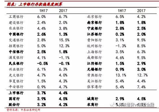 测算方法:我们分别对1H17、2017年上市银行的存款偏离度情况进行了计算,根据月末存款偏离度的计算公式=(月末最后一日各项存款-本月日均存款)/本月日均存款*100% ,其中“月末最后一日各项存款”为1H17、2017年末的时点数值;“本月日均存款” 由于数据不可得,我们采用了1H17半年、2017年全年的日均余额数据进行估算,在计算结果方面有一定的误差,另由于2017年是全年的日均余额数据,与实际偏差值会更大。
