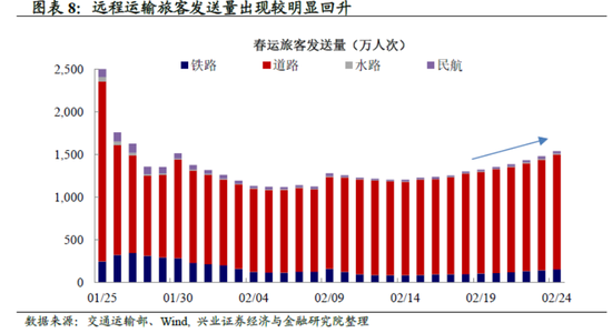 远程运输旅客发送量逐步回升,水路民航回升较快。2月18日,春运旅客发送量超过了前期2月9日的高点,并开始逐步回升,但是春运运输旅客量绝对值仍处于较低水平,2月24日春运旅客发送量仅为1月10日的23%。民航、铁路、公路周环比涨幅分别为28.10%、23.06%、9.68%,或体现了远程人口迁徙的增加。