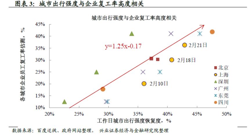 对前期跟踪框架的补充:城市内部出行强度对复工率具有较好指示意义。在本篇报告中,通过对百度迁徙数据进行清洗,我们在原有的跟踪框架中,新补充了城市内部的出行强度指标(即城市内部出行人员占城市居住居民的比例)。理论上而言,出行强度的增加意味着居民的经济活动(包括工作、生活)也出现回升,而正如后文所示,清洗之后的该数据与企业复工率表现出较强的相关性,具有较好的指示意义。