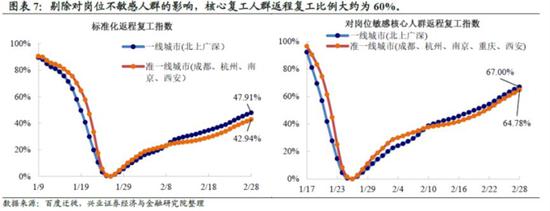 整体员工返程复工进程约为40%,对岗位敏感核心人群返程比例约为60%。将人员净流动指数累加后可以得到反映居民返程进度的返程复工指数。2月19日之后,返程复工进程开始加速,根据2月28日数据,一线城市返程比例为47.91%,准一线城市返程比例为42.94%,二者之间的差距自2月19号开始在逐步缩小。如果将除夕前一周返乡人群视为对在岗工作较敏感的“核心复工人群”,即剔除了对企业复工影响较小的老人、在校学生、未工作等群体,一线城市与准一线城市核心复工人群返程复工指数分别为67%和64.78%。目前员工返程仍在持续进行,按照返程复工比例当前约10%/周的返程速度,回乡居民完全返程仍需要约5-6周的时间。