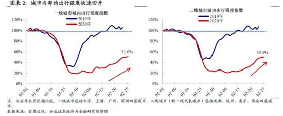 但从2月中旬开始,城市内部出行强度开始出现明显的回升。截止2020月2月27日,一线城市出行强度从低点的20%上升至51%,二线城市上升至50.5%,与复工和城际之间交通流的修复相比,城市内部经济活动的回升更为迅速。而后文我们的分析指出,城内出行强度的上升可能与企业复工高度相关。在高质量复工数据比较缺失的情况下,清洗之后的城内出行强度是一个很有指示意义的指标。
