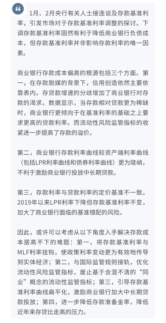 第三,引导存款基准利率曲线扁平化,降低较长期限存款的成本,简并目前多达五档的定期存款基准利率,给予市场更多的为期限溢价定价的空间,进而激励商业银行投放中长期贷款