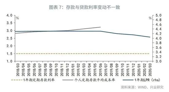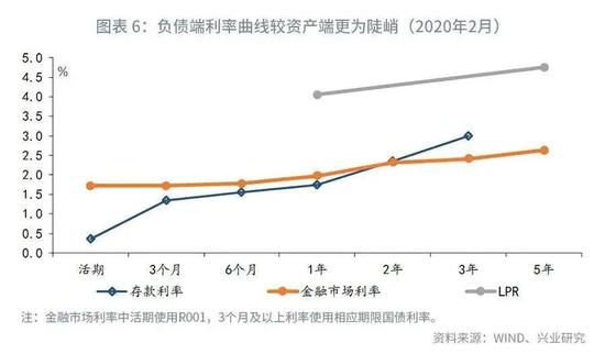 第二,商业银行存款利率曲线过于陡峭。目前我国的定期存款基准利率存在3个月、6个月、1年、2年和3年五种期限。其中,3年期存款基准利率较1年期存款利率高出125bp,相形之下商业银行资产端的利率曲线却更为平缓:以2020年2月均值为例,3年期国债收益率较1年期仅高出44bp;5年期LPR较1年期仅高出70bp。如果假定资产曲线的期限利差是合理的,且希望商业银行能够增加长期限融资的话,那么,存款的基准利率曲线就显得过于陡峭,由此导致长期限投资的盈利空间较短期投资更窄,不利于引导商业银行增加对实体经济的中长期资金支持。