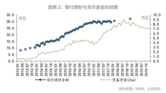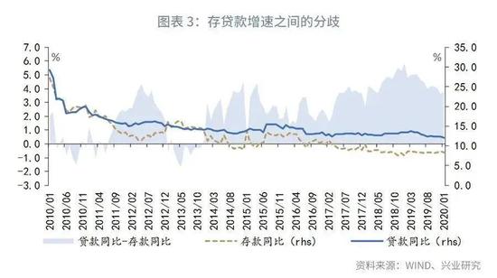 同时,随着利率市场化的深入,居民的投资渠道增加,对市场利率变化更为敏感,使得大量存款转而投向货币基金、银行理财和信托等,以获取更高的收益,由此使得商业银行的存款出现“脱媒”。在存款脱媒的情况下,经济对于商业银行表内的信贷和债券融资需求比例,却并没有多少下降,特别表内贷款仍然是我国信用扩张的主要渠道。在2019年新增社会融资规模中,新增人民币贷款占到了66%。这一现象使过去较为一致的存款增速与贷款增速,出现了持续的缺口。2013年12月以来,金融机构存款余额同比增速持续低于贷款余额同比增速。这一时点恰好是利率市场化深入、货币基金规模高速膨胀的时期。到2020年1月,金融机构存款余额同比增速仅为8.3%,较同期贷款余额增速低3.8个百分点。