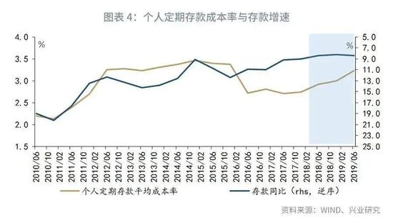 存款相对于贷款更低的增速增加了商业银行对存款的渴求。数据显示,个人定期存款平均成本率与存款同比增速之间存在一定的反向关联。当存款增长较慢时,存款成本容易提高;而存款增速的提升可能使存款成本下降。不过,2018年以来这种现象却发生了变化:2018年以来的存款同比增速虽然稳定下来了,但存款平均成本率继续上升。这是由于更为严格的流动性风险监管指标,迫使商业银行向存款支付了更高的溢价,虽然商业银行并不缺“钱”(但缺符合流动性监管要求的“一般性负债”),但却需要维持各类国际通用和中国特色的流动性监管指标的持续达标。2018年5月银保监会发布了《商业银行流动性风险管理办法(试行)》,新引入了净稳定资金比例、流动性匹配率和优质流动性资产充足率三个量化指标(后两项指标是我国所特有的)[3]。其中,净稳定资金比例和流动性匹配率指标的计算中实际上都在引导商业银行更多地吸收存款。