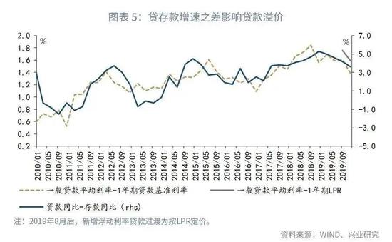 吸收存款的压力以价格的形式传导到了贷款端。如果我们以贷款增速和存款增速之差刻画存款的相对稀缺性,可以发现,当这一差值扩大时,也就是存款相对更稀缺时,一般贷款平均利率与1年期贷款基准利率(2019年8月后主要观察1年期LPR)的差值越高,商业银行越倾向于在基准利率的基础之上要求更高的贷款利率。从这个角度上看,存款成本偏高的症结不仅在于价,更在于量。