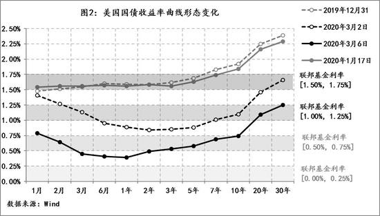 与对于疫情的认识和疫情的发展同步,美债收益率曲线的形态也发生明显变化:在1月20日新冠肺炎“人传人”确认之前,虽然关于疫情的信息持续增加,但美债收益率曲线形态没有太多变化,例如2019年12月31日和2020年1月17日曲线近乎重合。