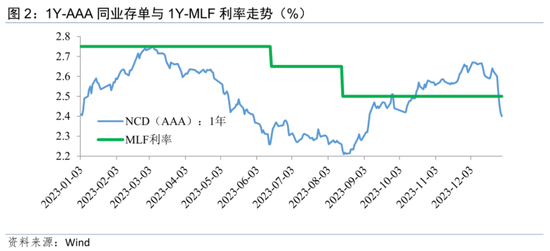 但同业存单利率延续高位的可能性也较小。一方面,银行业净息差压力较大,具有负债成本管控需求,存款利率已于2023年12月22日再度下调,且存在继续下调的可能性,同业存单发行利率将不会过高。另一方面,2024年一季度存在降息可能性,若降息加快落地,则利率中枢将整体下移。此外,若同业存单利率与MLF利率的利差处于历史较高位置,也将加大配置吸引力。