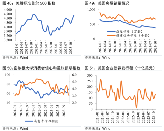 随着2023年12月美联储议息会议再度停止加息,市场一致预期美联储加息周期大概率已结束,且降息提上日程,在乐观情绪下美股标普500再度上涨,达到2021年高位。但是长时间的高利率水平已经显现出对经济增长的抑制作用,从房屋销售量、消费者信心指数和企业发债融资的情况来看,均较2021年更弱,因此高涨的美股指数存在一定溢价。进入2024年上半年,当乐观情绪消减,交易逻辑回归基本面时,美股或具有下行空间。同时,美国通胀回落仍有波折,2024年上半年美联储很可能继续保持限制性利率,也对美股下挫存在引导作用。