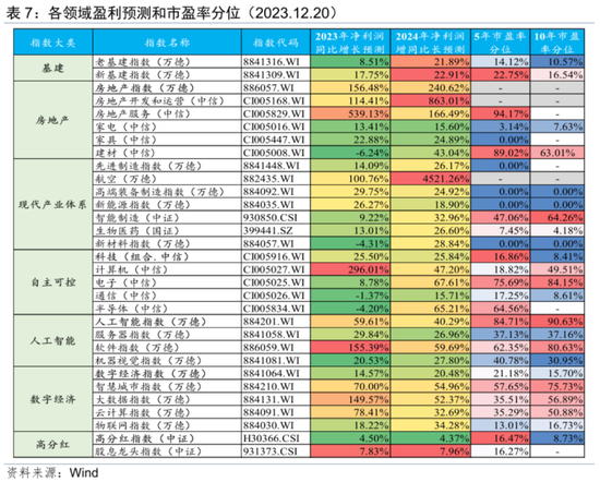 从盈利预测和估值水平来看,基建板块的新基建在盈利能力方面明显强于老基建,且估值水平仅略高于老基建,可以短期内重点关注;房地产板块则因前期收入水平过低,预测盈利增长较好,且市盈率很高,甚至出现收入为负无法计算市盈率的情况,实际估值水平偏低,短期政策预期可能带动波段行情;现代产业和科技板块经历了较明显的调整阶段,只有智能制造、电子、半导体相对坚挺,盈利能力较好的高端装备制造、新能源、生物医药、计算机和通信的估值处于较低位置,可以中长期重点关注;人工智能和数字经济依然火热,可在服务器、机器视觉、大数据、云计算等板块挖掘机会;高股息的龙头公司当前估值相对合理,盈利能力稳定,是中长期的配置选项。