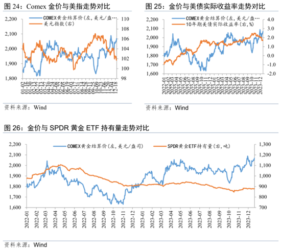 美元、美债收益率下行,央行“购金潮”延续,2024年金价震荡偏强。2024年,一是美联储加息周期大概率已经结束,并将转向降息,相应的美元指数、美债收益率大概率会双双回落,金价则会相应走高。不过鉴于美国经济的韧性,美联储维持高利率的平台期或比市场预期的更长,美元指数以及实际美债收益率下行幅度或也有限。二是全球央行购金速度仍较快,同时从近期数据看,黄金ETF持仓量也有触底回升迹象,需求端对金价的支撑力量依然较强。三是国际地缘政治、全球贸易格局的深层次的影响仍在持续蔓延,潜在的地缘冲突可能会更加频繁,同时一些主要经济体存在经济衰退风险,避险需求可能仍会阶段性地给予黄金支撑。不过,由于黄金市场明显在不断抢跑美联储降息预期,且有可能低估美国经济的韧性以及美联储维持高利率的决心,故后期金价走势仍存在较大幅的震荡的可能。