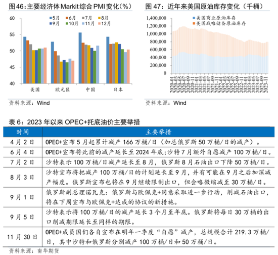 从需求端看,全球经济增速与原油需求增速往往变化一致,目前来看全球经济总体而言较为低迷,2023年5月以来各主要经济体经济景气度普遍下行。在IMF 10月发布的《世界经济展望》中,其预计2024年全球经济增速为2.9%,较2023年还有所下降,这意味着原油需求或并不乐观。不过,包括美国在内全球原油库存整体仍处于低位水平,美国商业原油库存四季度以来虽已明显增加,但仍明显低于2020年以来的平均水平,并且美国明年还要补充战略石油储备,这也会对油价提供一定的支撑。