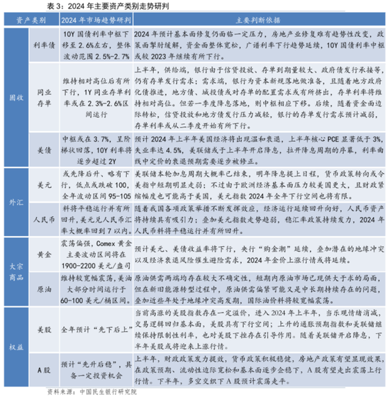 2024年,资产价格预计总体将表现为“内外均有机会,股债强于商品”,国内权益机会强于固收,美股美债全年均可看多。虽然A股估值回升空间大于国内债市,但对银行机构配置盘而言,需把握国内利率债中枢高位适度加大配置。黄金谨慎看多,原油和人民币等维持中性。