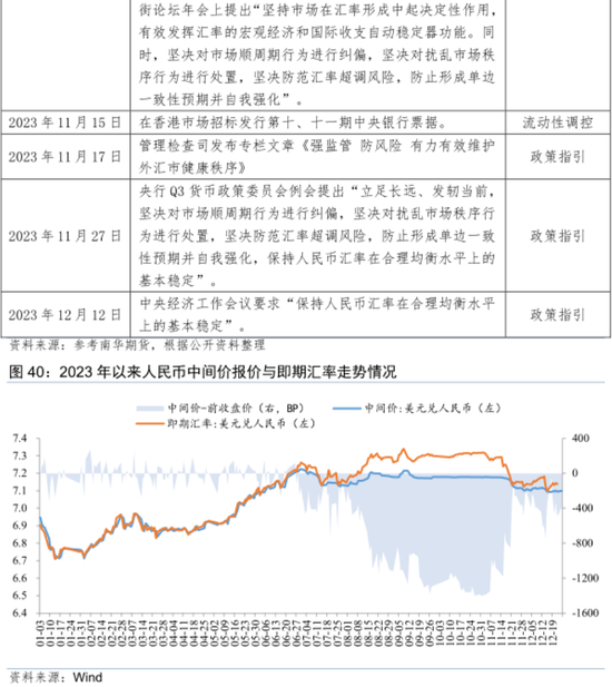 稳汇率政策持续发力,管理工具丰富足以保障市场平稳运行。自2023年6月下旬以来,政策当局针对人民币汇率不断发声,以稳定汇率预期,也相继采取了跨境融资宏观审慎调节参数上调、提高离岸人民币资金成本以及中间价与上一日收盘价大幅偏离,有效降低市场的顺周期性。特别是自8月中下旬后,中间价报价偏离前日收盘价幅度持续保持在1000bp左右,监管部门稳汇率的力度明显加强。年末随着人民币汇率大幅反弹,监管干预的强度有所减弱。由于在中央金融工作会议、中央经济工作会议中,均对稳定人民币汇率有专门的强调,故可以预期,2024年稳汇率政策举措将持续发力显效,鉴于我国汇率管理工具较为丰富,将足以保证人民币汇率在合理均衡水平上的基本稳定。