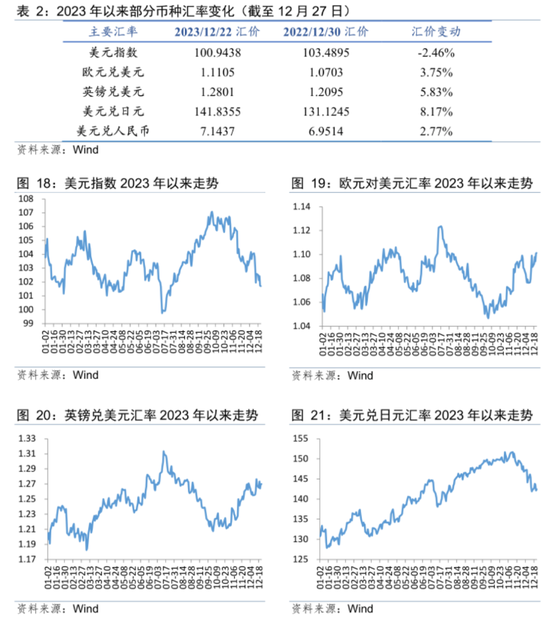 2023年以来,受美联储加息预期几度反转影响,美元指数出现较大幅波动,截至12月27日,美元指数较上年末跌2.46%。美元波动令其他主要非美货币普遍呈现宽幅震荡格局:欧洲央行、英国央行较大幅度加息助力欧元、英镑震荡走强,其中由于英国未受银行业危机影响,英镑表现更加突出;日美货币政策分化延续,日元继续震荡走弱。
