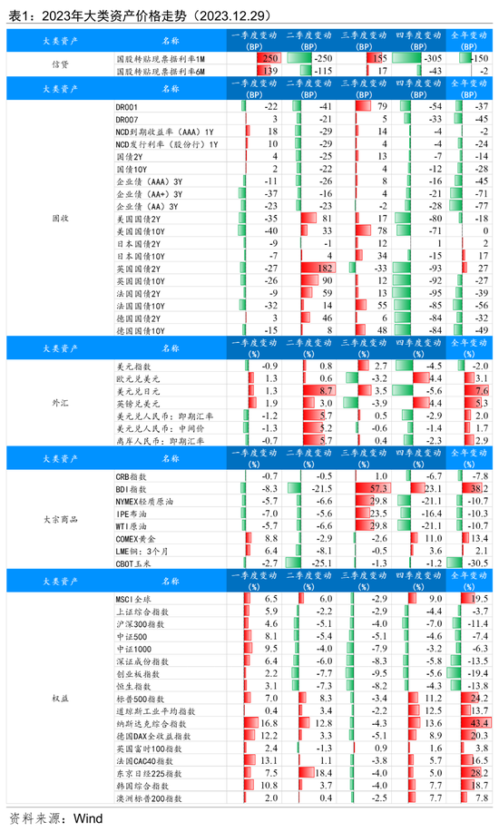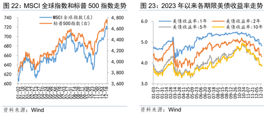 境外方面,美元大幅波动,股强债弱,商品大幅震荡。美元指数波动幅度较大,带动其他主要非美货币呈现宽幅震荡格局;截至2023年12月27日,MSCI全球指数和标普500指数分别较2022年末上涨20.14%和24.54%;美债收益率普涨,10Y美债收益率较2022年末上行9bp;国际金价出现较大幅度波动,总体延续震荡上行态势;国际油价呈现较大幅震荡行情,较上年末走跌。
