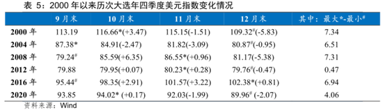 此外,从2000年以来的几次大选年来看,除2012年外,其余五年单从月线来看美元指数四季度都经历了较大幅度的震荡,2024年四季度同样大幅震荡的行情或再度出现。综合来看,美元指数 2024 年可能依旧呈现出较大幅震荡行情,总体趋势上或为先降后升、略有下行,但低点大概率会跌破100,全年波动区间为95-105。