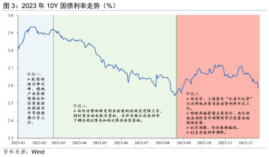 2023年8月之前,10Y国债利率仅在1月受疫情快速达峰过峰、稳地产政策继续推出和信贷座谈会提前召开等强预期引导下迅速上行,但在2月短暂的震荡之后,开始持续下行,直到8月21日至最低点2.54%。这一阶段下行行情主要是由经济整体修复明显放缓的弱现实逻辑主导,同时资金面整体稳健,且伴有银行存款利率下调及两次降息、两次降准政策落地。