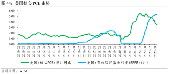 美联储本轮加息大概率已结束。美国经济数据尽管有韧性但已呈现下行趋势,2024年美国财政支持或将退坡、企业资本开支和订单乏力也将进一步拖累经济增长,叠加高利率对经济活动的限制尚未完全显现,在当前这样一个总体令美联储还算满意的经济状况下,美联储后续继续加息的概率已经不大。诚如鲍威尔在2023年12月议息会议后所言,目前联邦基金利率“或已接近本轮紧缩周期的峰值”,与会美联储官员也普遍认为,“进一步加息不太可能是合适的”。当然,考虑到2023年下半年以来美国通胀预期下降并不明显,未来或也存在不能实现通胀目标的风险,故美联储12月议息会议并未完全排除进一步加息的可能性。