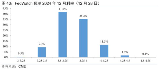 市场预计2024年3月开始降息,但实际降息起始点或偏晚一些。一方面美国通胀率绝对水平仍较高,核心通胀粘性依然较强,另一方面在财政依然较为宽松的情况下,美国经济的韧性有可能比市场预期的要更持久。特别值得一提的是,过去一年美国通胀放缓更多来自供给复苏,如供应链的修复、劳动力参与率的提高、以及能源价格的下降,而未来进一步降低核心通胀则需更多依靠需求放缓,这必然要求实际利率在较长时间内维持高位。从CME美联储观察工具来看,市场预期美联储首次降息时间在12月议息会议后再次提前到2024年3月,2024年大概率降息幅度则由12月议息会议前的1%-1.25%增加到1.5%-1.75%。而美联储12月点阵图预测的降息幅度0.75%要明显小于市场预期。综合来看,我们认为2024年美联储启动降息的时间可能晚于当前市场预期,降息幅度或是当前市场预期与美联储预期的折中,共降3-4次,累计降幅为0.75%-1%。这也与美联储对未来核心通胀降幅的预测相吻合(2024年末中值较2023年末中值降0.8%),从而仍保持实际利率在当前的限制性水平上。不过不排除当美国失业率上升速度超预期或通胀超预期降温时,美联储增加降息次数。