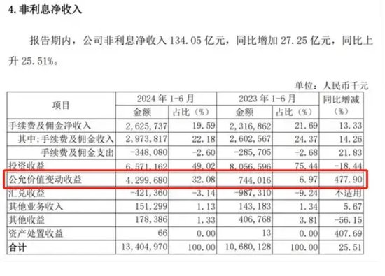 根据财报,南京银行2024年上半年公允价值变动收益比去年同期增加477.9%,达到了42.99亿元,2023年上半年公允价值变动收益是7.44亿元。