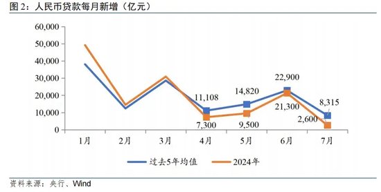 7月为传统信贷小月,月内贷款投放普遍呈季节性回落,在季节性效应、“挤水分”影响难以快速消退以及信贷有效需求不足等叠加作用下,7月新增信贷强度不高,不及过去五年同期均值(8315亿元)。