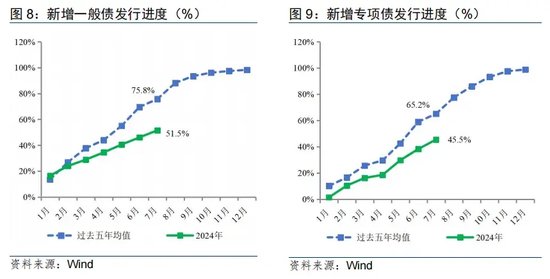 1-7月累计,新增一般债和专项债发行进度分别为全年的51.5%和45.5%,均低于过去五年的均值(75.8%、65.2%),今年以来地方债发行进度整体偏慢。
