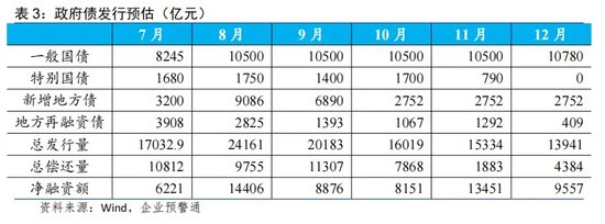 根据发行计划测算,8、9月政府债发行量都在2万亿元以上,三季度和四季度政府债净融资额均在3万亿元左右,有望支撑后续社融增速维持在相对高位。