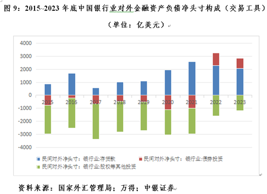 从交易工具看,过去两年我国银行业对外净资产增加,主要是因为债券投资项下净资产增加1758亿美元,贡献了84.8%;股权等其他投资项下净负债减少808亿美元,贡献了39.0%;存贷款项下净资产增加492亿美元,负贡献23.7%(见图9)。