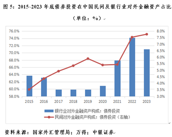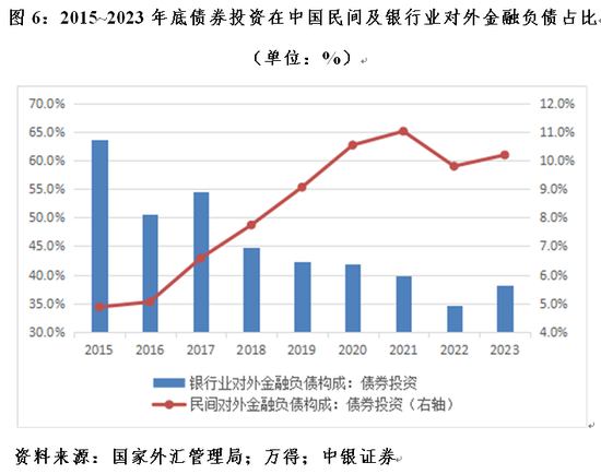 另外,我国早在2018年之前就开始降低对美债券投资的风险敞口,但近年来有所反复。根据对外证券投资资产数据,到2018年底,我国对外债券投资资产中,美国占比26.3%,较2015年底回落17.8个百分点。2018年之后进一步下跌,低至2021年底的20.4%。此后触底反弹,2023年底升至26.6%,高出2018年底0.3个百分点。银行业是主要推手。到2023年底,我国银行业对外债券投资资产中,美国占比26.6%,较2021年底上升10.0个百分点;我国对美国债券投资资产中,银行业占比71.0%,上升15.7个百分点。