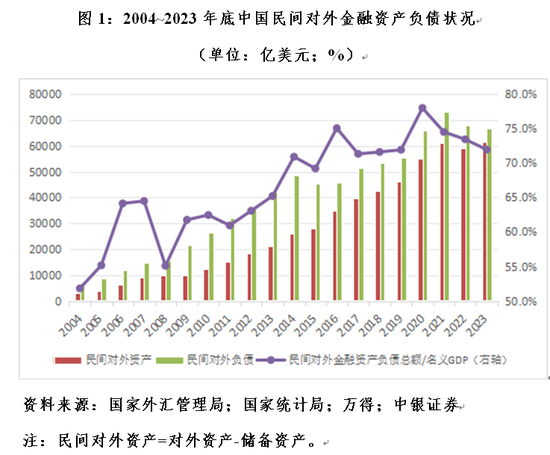 由于我国银行业对外金融资产负债数据仅可以追溯到2015年底,故对于此前的情形只能用IIP数据去做合理推测。截至2023年底,我国民间对外金融资产余额(剔除储备资产)6.13万亿美元,较2008年底增加5.13倍;对外金融负债余额6.67万亿美元,增加3.24倍;民间对外金融资产负债总额12.81万亿美元,相当于名义国内生产总值(GDP)的71.9%,上升16.9个百分点(见图1)。1998年和2008年两次国际金融危机中,我国受外部金融冲击较小,主要是因为彼时资本外汇管制较严,金融开放程度较低。而前述情况表明,2009年以来,我国对外金融资产和负债的风险暴露均有所增加。