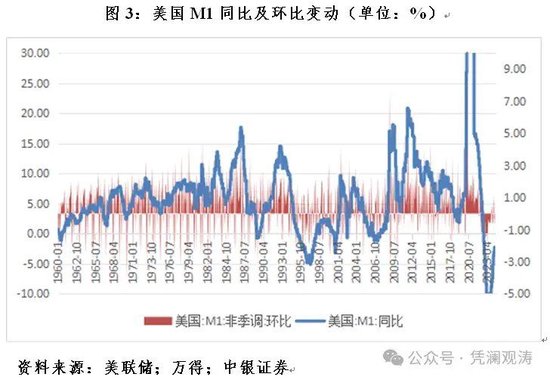 2022年10月至2024年6月,美国M1已连续20个月同比负增长,平均下跌7.2%(中国4个月平均下跌4.3%)。鉴于2020年3月~2022年3月,美国M1连续25个月两位数甚至三位数的正增长,现在M1负增长属于均值回归。到2024年6月,美国M1同比下降2.3%,但2020年至2024年6月五年复合平均增长36.3%,较疫情前五年同期趋势值仍高出29.9个百分点。而且,M1负增长并未影响美国三大股指迭创新高,房地产价格持续高企。美联储在最新的半年度金融稳定报告中,还再次预警资产价格估值偏高的风险。其实,美国M1不但同比负了,环比更是早就负了。2022年5月至2023年11月,美国M1经历了连续19个月的环比负增长(见图3)。