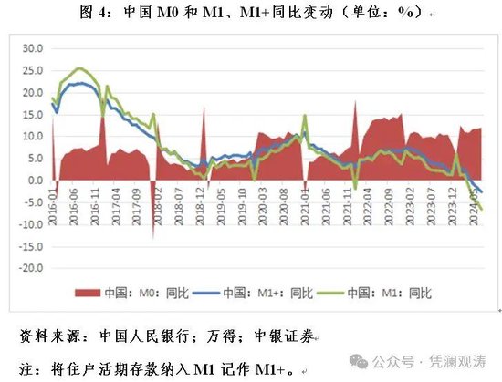 中国M1增速下行是不争的事实。2024年7月,M1同比下降6.6%,2020年至2024年7月五年复合平均增长2.7%,低于疫情前五年同期趋势值8.1个百分点。但对M1的统计口径进行调整优化后,前述情形有所改善。如将住户活期存款纳入M1口径算作M1+,中国M1+同比负增长的时间将延后一个月,且降幅将比现值收窄3~4个百分点(见图4)。对3个月移动平均的M1和M1+同比变动与3个月移动平均的CPI同比变动做相关性分析显示,2022年1月至2024年7月,二者分别为强正相关0.585和0.626,也就是说M1+比M1对中国CPI的相关性更高。