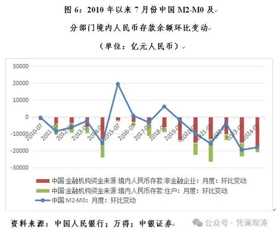 此外,7月份金融数据还有个引起市场哗然的现象,就是人民币存款环比下降。然而,2010年以来的每年7月份,除2015、2016和2018年外,中国M2-M0有12个年份环比下降。2024年7月,M2-M0环比减少18204亿元,但峰值是上年同期的19703亿元。分部门看,过去15年来,非金融企业和住户境内人民币存款余额每年7月份均环比下降。其中,2024年7月,住户境内人民币存款余额环比减少3319亿元,峰值为2021年7月的13559亿元,当时正值中国本土疫情得到基本控制,经济较快恢复;非金融企业境内人民币存款余额环比下降17803亿元,为十年来同期新高(见图6)。显然,在解读当月人民币存款余额变动时,不应忽视季节性因素的影响。