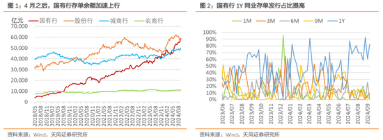4月禁止手工补息之前,股份行余额上行较快,禁止手工补息后,国有行同业存单发行加快,余额迅速上行。