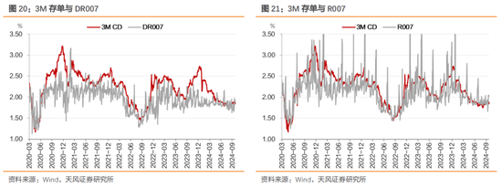 存单利率与资金利率走势相关性较强,资金利率可以视为CD利率的下限。历史上仅在部分年份的年末有所偏离,比如2023年11月至2024年3月二者也出现了明显的偏离,4月以来存单利率进一步贴近资金利率。