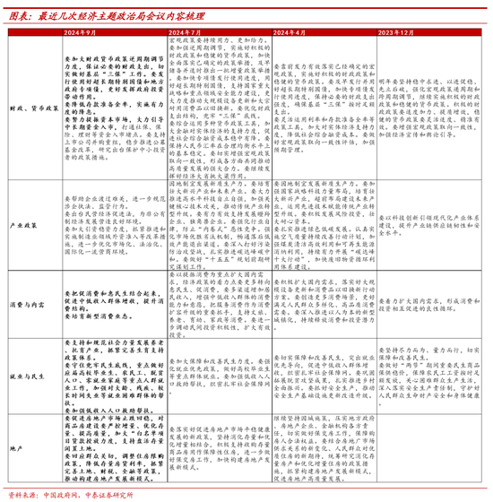 内容与展望:从金融政策到财政政策,“两个确定”与“一个观察”。(1)内容:本次政治局工作会议将重点放在财政政策上,与924金融口会议相辅相成,从金融政策到财政政策的较快推进反映了政策对稳增长的明确决心。另外,对地产表述措辞积极,风向变化明显,对居民购买力、房企流动性、群众关切均有提及。(2)展望:“两个确定”与“一个观察”。①政策方向的确定:四季度财政政策的发力将会加快,资金来源为超长期特别国债和地方政府专项债。②投向领域的确定:扩内需、促消费、惠民生,本次政治局会议对内需、消费和民生领域的重视程度加强,预计生育、失业等相关补贴以及对中低收入人群的转移支付等措施可能会有落地,另外养老、教育、医疗等民生工程和社会服务项目的投入也有可能会进一步加大。③政策力度与规模的观察:在政策方向和投向领域确定性较强的基础上,后续需重点观察政策落地的力度与规模。